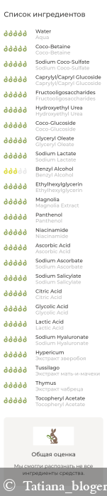 Aqua, Coco-Betaine, Sodium Coco-Sulfate, Caprylyl/Capryl Glucoside, Fructooligosaccharides, Hydroxyethyl Urea, Coco-Glucoside, Glyceryl Oleate, Sodium Lactate, Benzyl Alcohol, Ethylhexylglycerin, Magnolia Extract, Panthenol, Niacinamide, Ascorbic Acid, Sodium Ascorbate, Sodium Salicylate, Citric Acid, Glycolic Acid, Lactic Acid, Sodium Hyaluronate, Экстракт зверобоя, Экстракт мать-и-мачехи, Экстракт чабреца, экстракт берёзовых почек, Tocopheryl Acetate
