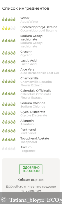 Aqua/Water, Cocamidopropyl Betaine, Sodium Cocoyl Isethionate, Glycerin, Lactic Acid, Aloe Barbadensis Leaf Gel, Chamomilla Recutita Flower Extract, Calendula Officinalis Flower Extract, Sodium Chloride, Glycole Distearate, Allantoin, Panthenol, Tocopherol, Fragrance.