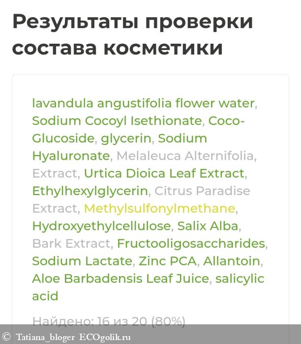 lavandula angustifolia flower water (гидролат лаванды); Sodium Cocoyl Isethionate(Изетионат натрия); Coco-Glucoside (Коко-Глюкозид); glycerin (глицерин); Sodium Hyaluronate (Гиалуронат Натрия); Melaleuca Alternifolia (Tea Tree); Extract (Экстракт чайного дерева); Urtica Dioica Leaf Extract (экстракт крапивы); Ethylhexylglycerin (этилгексилглицерин); Citrus Paradise Extract (Экстракт грейпфрута); Methylsulfonylmethane (Сера МСМ); Hydroxyethylcellulose (гидроксиэтилцеллюлоза); Salix Alba (White Willow); Bark Extract (Экстракт ивы); Fructooligosaccharides (Фруктоолигосахариды); Sodium Lactate (Лактат натрия); Zinc PCA (Цинк РСА); Allantoin (аллантоин); Aloe Barbadensis Leaf Juice (Алоэ вера гель); salicylic acid (салициловая кислота)