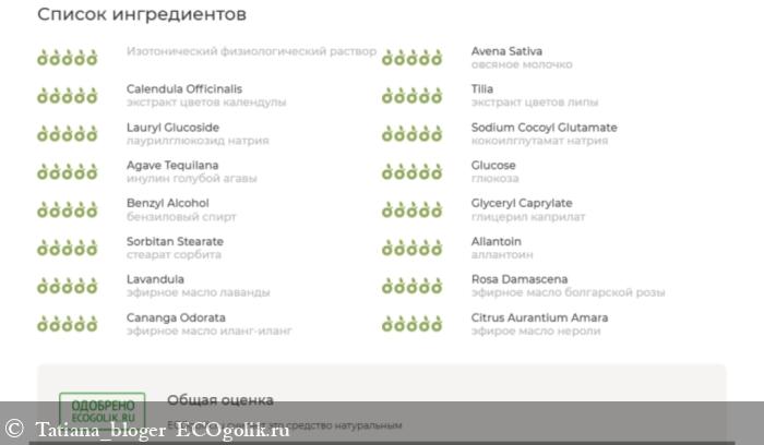 Изотонический физиологический раствор, овсяное молочко (отстоянное и отфильтрованное), экстракт цветов календулы, экстракт цветов липы, лаурилглюкозид натрия, кокоилглутамат натрия, инулин голубой агавы, глюкоза, бензиловый спирт, глицерил каприлат, стеарат сорбита, аллантоин, эфирное масло лаванды, эфирное масло болгарской розы, эфирное масло иланг-иланг, эфирное масло нероли.
