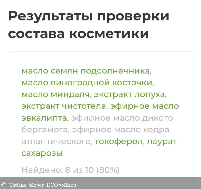 масло семян подсолнечника, масло виноградной косточки, масло миндаля, экстракт лопуха, экстракт чистотела, эфирное масло эвкалипта, эфирное масло дикого бергамота, эфирное масло кедра атлантического,токоферол (витамин E), лаурат сахарозы