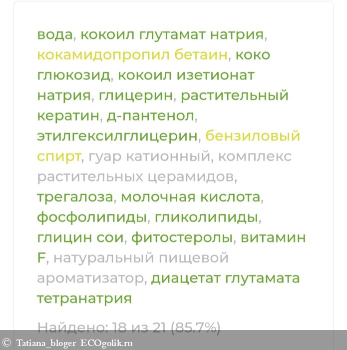 вода, кокоил глутамат натрия, кокамидопропил бетаин, коко глюкозид, кокоил изетионат натрия, глицерин, растительный кератин (гидролизованные протеины пшеницы и сои, карбоцистеин, треонин, серин, глутаминовая кислота), д-пантенол, этилгексилглицерин (и) бензиловый спирт, гуар катионный, комплекс растительных церамидов, трегалоза, молочная кислота, фосфолипиды (и) гликолипиды (и) глицин сои (и) фитостеролы (и) витамин F, натуральный пищевой ароматизатор, диацетат глутамата тетранатрия.