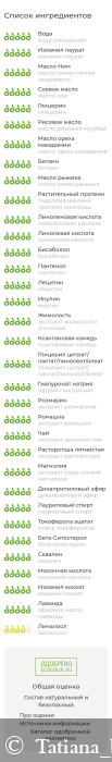 вода очищенная, изоамил лаурат2, масло семян мелии азадирахта (дерева ним), масло сои2, глицерин (растительный), масло рисовых отрубей, масло ореха макадамии, бетаин (натуральный), масло семян рыжика, гидролизованный протеин пшеницы, линоленовая кислота2, линолевая кислота2, бисаболол3 (натуральный), пантенол, лецитин, инулин2 (растительный), экстракт жимолости душистой, экстракт жимолости японской, ксантановая камедь, глицерил цитрат/лактат/линолеат/олеат, натрия гиалуронат2, экстракт розмарина, экстракт ромашки, экстракт лаванды, экстракт зеленого чая, экстракт расторопши, экстракт коры южной магнолии2, дикаприловый эфир2, лауриловый спирт2, смесь токоферолов2, бета-ситостерол2, сквален2 (растительный), молочная кислота, изоамил кокоат2, эфирное масло лаванды, линалоол4.