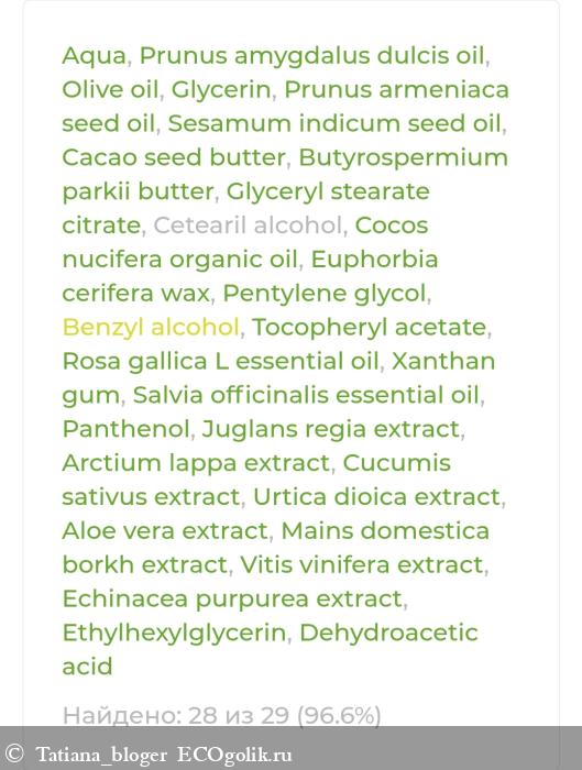 Aqua (вода дистиллированная), Prunus amygdalus dulcis (sweet almond) oil (масло миндаля), Olive oil (масло оливковое), Glycerin (глицерин), Prunus armeniaca seed oil (масло абрикосовых косточек), Sesamum indicum seed oil (масло кунжутное), Cacao (cocoa) seed butter (масло какао), Вutyrospermium parkii (shea) butter (масло ши), Glyceryl stearate citrate (глицерил стеарат цитрат), Cetearil alcohol (цетилстеариловый спирт), Cocos nucifera (coconut) organic oil (масло кокоса органик), Euphorbia cerifera (candelilla) wax (воск канделильский), Pentylene glycol* (пентилен гликоль), Benzyl alcohol (бензиловый спирт), Tocopheryl acetate (витамин Е), Rosa gallica L. essential oil (эфирное масло розы), Xanthan gum (ксантановая камедь), Salvia officinalis essential oil (эфирное масло шалфея), Panthenol (Д-пантенол), Juglans regia extract (экстракт грецкого ореха), Arctium lappa extract (экстракт лопуха), Cucumis sativus extract (экстракт огурца), Urtica dioica extract (экстракт крапивы), Aloe vera extract (экстракт алоэ вера), Mains domestica borkh extract (экстракт яблока), Vitis vinifera extract (экстракт винограда), Echinacea purpurea extract (экстракт эхинацеи), Ethylhexylglycerin (этилгексилглицерин), Dehydroacetic acid (дегидроуксусная кислота). *изготовлен из багассы, получаемой из сахарного тростника.