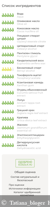 Aqua (вода дистиллированная), Olive oil (масло оливковое), Cocos nucifera (coconut) oil (масло кокосовое), Glyceryl stearate citrate (глицерил стеарат цитрат), Cetearyl alcohol (цетилстеариловый спирт), Pentylene glycol* (пентилен гликоль), Euphorbia cerifera (candelilla) wax (воск канделильский), Benzyl alcohol (бензиловый спирт), Tocopheryl acetate (витамин Е), Xanthan gum (ксантановая камедь), Cucumis sativus (cucumber) fruit extract (экстракт огурца), Arctium lappa root extract (экстракт лопуха), Juglans regia leaf extract (экстракт грецкого ореха), Urtica dioica leaf extract (экстракт крапивы), Jasminum grandiflorum essential oil (эфирное масло жасмина), Ethylhexylglycerin (этилгексилглицерин), Dehydroacetic acid (дегидроуксусная кислота). *изготовлен из багассы, получаемой из сахарного тростника.