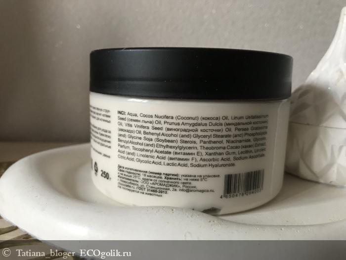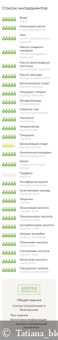 Aqua, Cocos Nucifera (Coconut) (кокоса) Oil, Linum Usitatissimum Seed (семян льна) Oil, Prunus Amygdalus Dulcis (миндальной косточки) Oil, Vitis Vinifera Seed (виноградной косточки) Oil, Persea Gratissima (авокадо) Oil, Behenyl Alcohol (and) Glyceryl Stearate (and) Phospholipids (and) Glycine Soja (Soybean) Sterols, Panthenol, Niacinamide, Glycerin, Benzyl Alcohol (and) Ethylhexylglycerin, Theobroma Cacao (какао) Extract, Parfum, Tocopheryl Acetate (витамин Е), Xanthan Gum, Lecithin, Linoleic Acid (and) Linolenic Acid (витамин F), Ascorbic Acid, Sodium Ascorbate, Citric Acid, Glycolic Acid, Lactic Acid, Sodium Hyaluronate