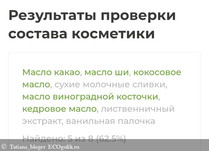 Масло какао, масло ши (карите), кокосовое масло, сухие молочные сливки, масло виноградной косточки, кедровое масло, лиственничный экстракт, ванильная палочка.