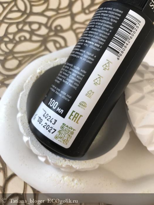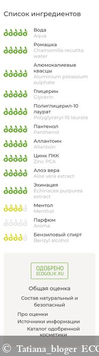 Aqua (вода дистиллированная), Chamomilla recutita water (гидролат ромашки), Aluminium potassium sulphate (алюмокалиевые квасцы), Glycerin (глицерин), Aloe barbadensis leaf juice (гель алоэ вера), Polyglyceryl-10 laurate (полиглицерил-10 лаурат), Panthenol (Д-пантенол), Allantoin (аллантоин), Zinc PCA (цинк ПКК), Aloe vera extract (экстракт алоэ вера), Echinacea purpurea extract (экстракт эхинацеи), Menthol (ментол), Aroma (ароматизатор), Benzyl alcohol (бензиловый спирт).
