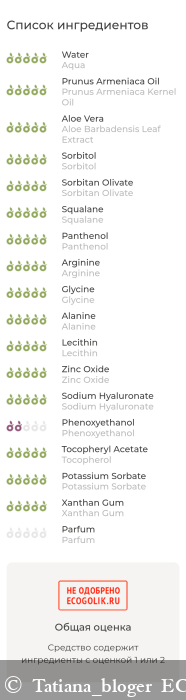 Aqua (Water), Prunus Armeniaca Kernel Oil, Aloe Barbadensis Leaf Extract, Sorbitol, Sorbitan Olivate, Squalane, Panthenol, Arginine, Glycine, Alanine, Lecithin, Zinc Oxide, Sodium Hyaluronate, Phenoxyethanol, Tocopherol, Potassium Sorbate, Xanthan Gum, Parfum (Fragrance)