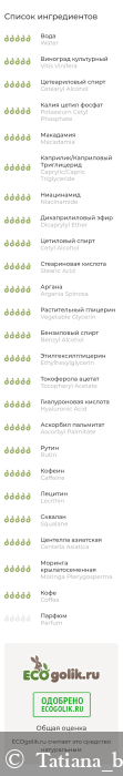 ВОДА, МАСЛО ВИНОГРАДНОЙ КОСТОЧКИ, ЦЕТЕАРИЛОВЫЙ СПИРТ, ЦЕТИЛФОСФАТ КАЛИЯ, МАСЛО МАКАДАМИИ, КАПРИЛИК/КАПРИК ТРИГЛИЦЕРИДЫ, НИАЦИНАМИД, ДИКАПРИЛИЛОВЫЙ ЭФИР, ЦЕТИЛОВЫЙ СПИРТ, СТЕАРИНОВАЯ КИСЛОТА, МАСЛО АРГАНЫ, ГЛИЦЕРИН РАСТИТЕЛЬНЫЙ, БЕНЗИЛОВЫЙ СПИРТ, ЭТИЛГЕКСИЛГЛИЦЕРИН, ТОКОФЕРОЛА АЦЕТАТ (ВИТАМИН Е), ГИАЛУРОНОВАЯ КИСЛОТА, АСКОРБИЛПАЛЬМИТАТ, РУТИН (ВИТАМИН Р), КОФЕИН, ЛЕЦИТИН, СКВАЛАН, ЭКСТРАКТ ЦЕНТЕЛЛЫ АЗИАТСКОЙ, ЭКСТРАКТ МОРИНГИ, ЭКСТРАКТ ЗЕЛЕНОГО КОФЕ, АРОМАТИЧЕСКАЯ КОМПОЗИЦИЯ