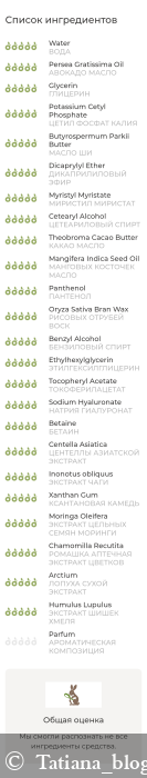 ВОДА, АВОКАДО МАСЛО, ГЛИЦЕРИН, ЦЕТЕАРИЛОВЫЙ СПИРТ, ЦЕТИЛ ФОСФАТ КАЛИЯ, МАСЛО ШИ (КАРИТЭ), ДИКАПРИЛИЛОВЫЙ ЭФИР, МИРИСТИЛ МИРИСТАТ, ЦЕТЕАРИЛОВЫЙ СПИРТ, КАКАО МАСЛО, МАНГОВЫХ КОСТОЧЕК МАСЛО, ПАНТЕНОЛ, АЛОЭ ДРЕВОВИДНОЕ ЛИСТЬЕВ ЭКСТРАКТ, РИСОВЫХ ОТРУБЕЙ ВОСК, БЕНЗИЛОВЫЙ СПИРТ, ЭТИЛГЕКСИЛГЛИЦЕРИН, ТОКОФЕРИЛАЦЕТАТ, НАТРИЯ ГИАЛУРОНАТ, БЕТАИН, ЦЕНТЕЛЛЫ АЗИАТСКОЙ ЭКСТРАКТ, ЭКСТРАКТ ЧАГИ, КСАНТАНОВАЯ КАМЕДЬ, ЭКСТРАКТ ЦЕЛЬНЫХ СЕМЯН МОРИНГИ, РОМАШКА АПТЕЧНАЯ ЭКСТРАКТ ЦВЕТКОВ, ЛОПУХА СУХОЙ ЭКСТРАКТ, ЭКСТРАКТ ШИШЕК ХМЕЛЯ, АРОМАТИЧЕСКАЯ КОМПОЗИЦИЯ