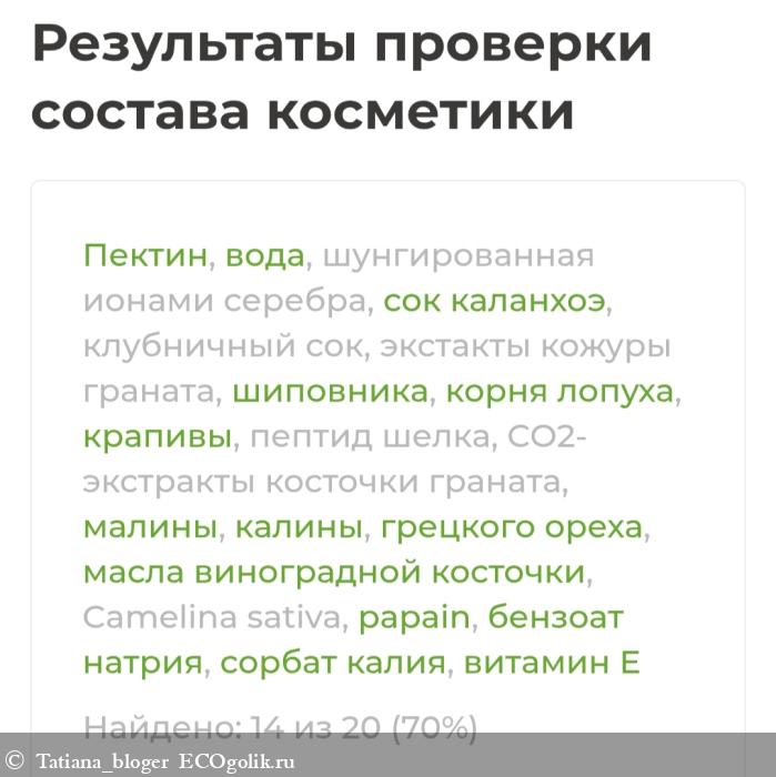 Пектин, вода, шунгированная ионами серебра, сок каланхоэ, клубничный сок, экстакты кожуры граната, шиповника, корня лопуха, крапивы, пептид шелка (silk peptipe), СО2- экстракты косточки граната, малины, калины, грецкого ореха, масла виноградной косточки, Camelina sativa, papain, бензоат натрия, сорбат калия, витамин Е