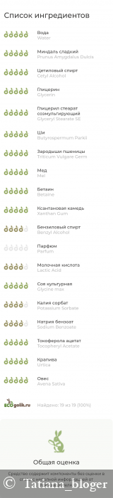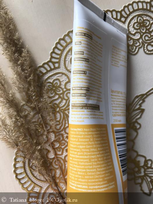Aqua (Вода), Prunus amygdalus Dulcis Oil (Масло миндальное), Cetyl Alcohol (Цетиловый спирт), Glycerin (Глицерин), Glyceryl Stearate SE (Глицерил стеарат), Butyrospermum Parkii Butter (Масло ши), Triticum vulgare Germ Oil (Масло зародышей пшеницы), Honey (Мёд), Betaine (Бетаин), Xanthan gum (Ксантановая камедь), Benzyl Alcohol (Бензиловый спирт), Perfume (Парфюмерная композиция), Lactic Acid (Молочная кислота), Hydrolyzed Soy Protein (Протеины сои), Potassium sorbat (Калия сорбат), Sodium Benzoate (Натрия бензоат), Tocopherol (Витамин Е), Urtica dioica L. Extract (Экстракт крапивы), Avena sativa L. extract (Экстракт овса).