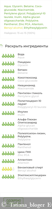 Aqua (вода дистиллированная), Glycerin (глицерин), Betaine (бетаин), Coco-glucoside (кокоглюкозид), Niacinamide (ниацинамид), Pentylene glycol* (пентилен гликоль), Polyglyceryl-10 laurate** (полиглицерил-10 лаурат), Inulin (инулин), Alpha-glucan oligosaccharide (альфа-глюкан олигосахарид), Polylysine (полилизин), Panthenol (Д-пантенол), Zinc PCA (цинк ПКК), Allantoin (аллантоин), Benzyl аlcohol (бензиловый спирт), Ethylhexylglycerin (этилгексилглицерин). *изготовлен из багассы, получаемой из сахарного тростника. **эмульгатор, полученный из жирных кислот кокосового и пальмового масла.
