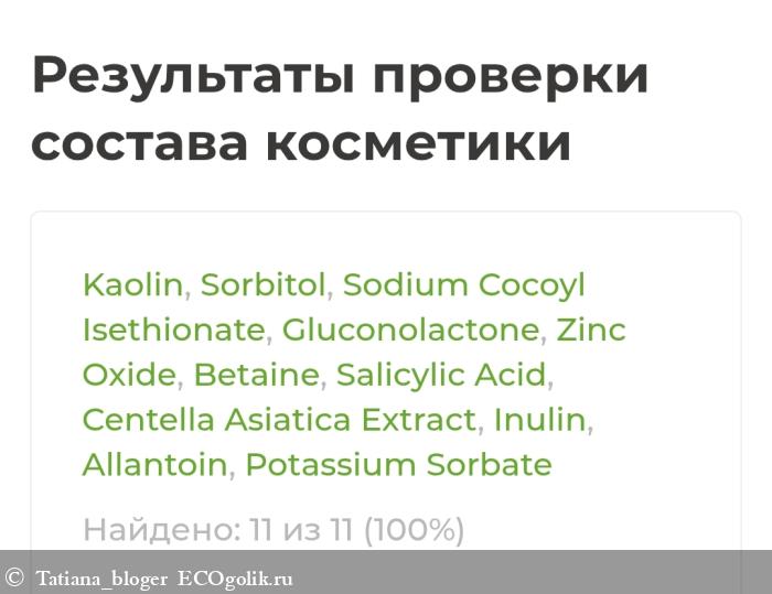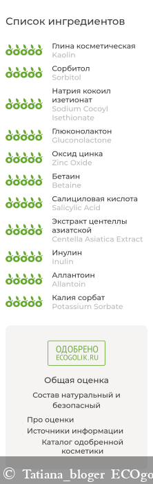 Kaolin, Sorbitol, Sodium Cocoyl Isethionate, Gluconolactone, Zinc Oxide, Betaine, Salicylic Acid, Centella Asiatica Extract, Inulin, Allantoin, Potassium Sorbate