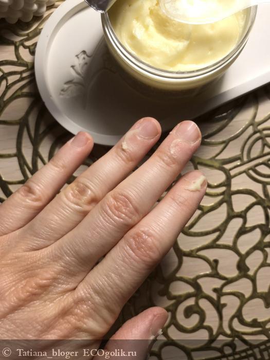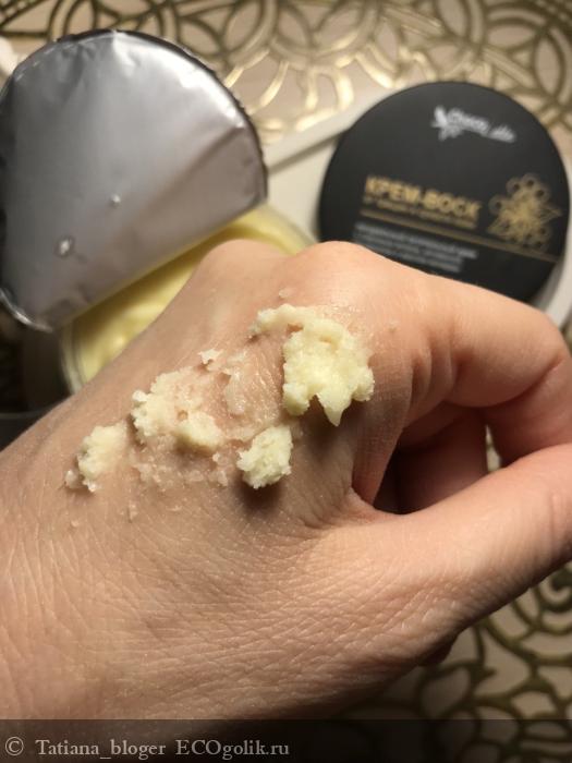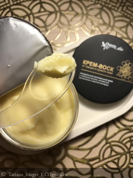 - Густая консистенция, комфортна в нанесении. При соприкосновении с теплом крем-воск начинает таять. Он легко распределяется, быстро впитывается, не оставляет липкости и плёнки.
