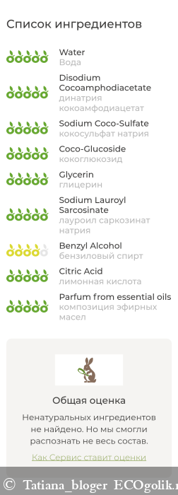 Вода, динатрия кокоамфодиацетат, кокосульфат натрия, кокоглюкозид, гидролат тархуна, глицерин, лауроил саркозинат натрия, бензиловый спирт, этилгексил-глицерин, экстракт бархата, лимонная кислота, композиция эфирных масел.