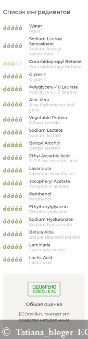 Aqua (вода дистиллированная), Sodium lauroyl sarcosinate (лауроил саркозинат натрия), Cocamidopropyl betaine (кокaмидопропилбетаин), Glycerin (глицерин), Polyglyceryl-10 laurate* (полиглицерил-10 лаурат), Aloe barbadensis leaf juice (гель алоэ вера), Wheat protein (пшеничный протеин), Sodium lactate (лактат натрия), Benzyl alcohol (бензиловый спирт), 3-O Ethyl ascorbic acid (3-0-этил аскорбиновая кислота), Lavender essential oil (эфирное масло лаванды), Tocopheryl acetate (витамин Е), Panthenol (Д-пантенол), Еthylhexylglycerin (этилгексилглицерин), Sodium hyaluronate (гиалуронат натрия), Betula alba bark extract (экстракт коры березы), Laminaria extract (экстракт ламинарии), Lactic acid (молочная кислота). * эмульгатор, полученный из жирных кислот кокосового и пальмового масла.