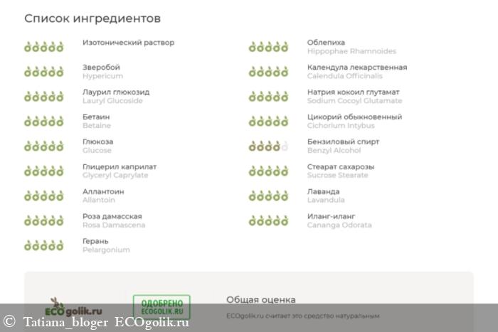 Изотонический физиологический раствор, экстракт листа облепихи, экстракт травы зверобоя, экстракт цветов календулы, лаурилглюкозид натрия, кокоилглутамат натрия, свекольный бетаин, инулин цикория, глюкоза, бензиловый спирт, глицерилкаприлат, стеарат сахарозы, аллантоин, эфирное масло лаванды, эфирное масло болгарской розы, эфирное масло иланг-иланг, эфирное масло герани.