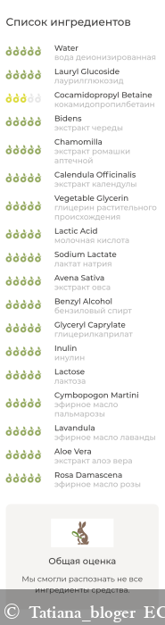 вода деионизированная, додецилглюкозид, лаурилглюкозид, кокамидопропилбетаин, экстракт череды, экстракт ромашки аптечной, экстракт календулы, глицерин растительного происхождения, цетилсульфосукцинат динатриевая соль, молочная кислота, лактат натрия, экстракт овса, бензиловый спирт, глицерилкаприлат, инулин, лактоза, эфирное масло пальмарозы, эфирное масло лаванды, экстракт алоэ вера, эфирное масло розы.