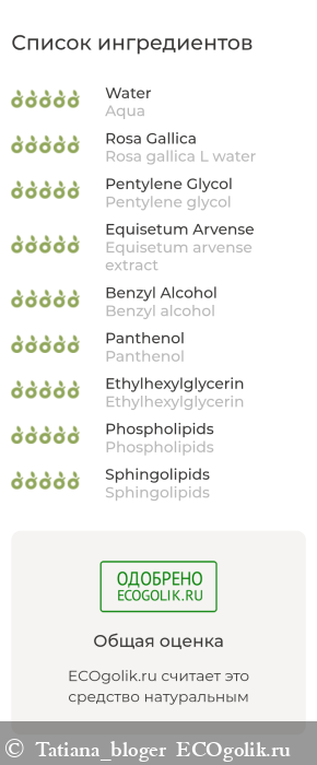 Aqua (вода дистиллированная), Rosa gallica L. water (гидролат розы), Pentylene glycol* (пентилен гликоль), Equisetum arvense extract (экстракт хвоща), Benzyl alcohol (бензиловый спирт), Panthenol (Д-пантенол), Ethylhexylglycerin (этилгексилглицерин), Phospholipids (фосфолипиды), Sphingolipids (сфинголипиды). *изготовлен из багассы, получаемой из сахарного тростника.