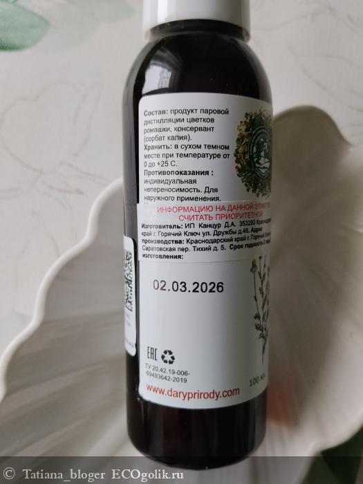 паровой дистиллят цветков ромашки, сорбат калия (натуральный пищевой консервант)