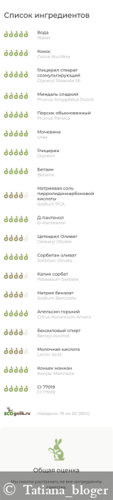 Вода, кокосовое масло, глицерил стеарат SE, миндальное масло, масло персиковое, мочевина, глицерин, бетаин, натриевая соль пирролидонкарбоновой кислоты, декспантенол, цетеарил оливат, сорбитан оливат, сорбат калия, бензоат натрия, эфирное масло магнолии, эфирное масло нероли, бензиловый спирт, молочная кислота, коньяк маннан, CI 77019.
