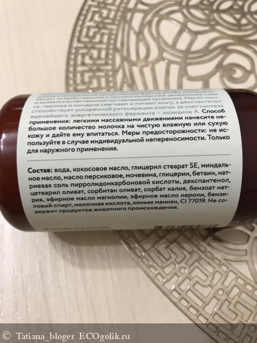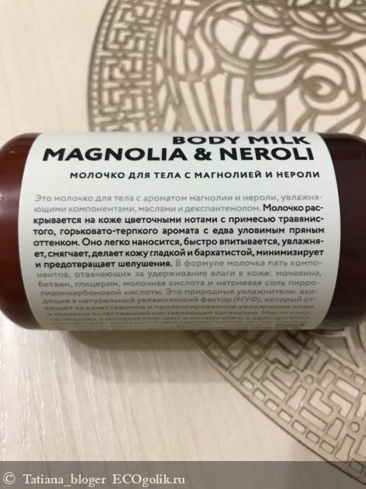 Это молочко для тела с ароматом магнолии и нероли, увлажняющими компонентами, маслами и декспантенолом. Молочко раскрывается на коже цветочными нотами с примесью травянистого, горьковато-терпкого аромата с едва уловимым пряным оттенком. Оно легко наносится, быстро впитывается, увлажняет, смягчает, делает кожу гладкой и бархатистой, минимизирует и предотвращает шелушения. В формуле молочка пять компонентов, отвечающих за удерживание влаги в коже: мочевина, бетаин, глицерин, молочная кислота и натриевая соль пирролидонкарбоновой кислоты. Это природные увлажнители, входящие в натуральный увлажняющий фактор (НУФ), который отвечает за качественное и пролонгированное увлажнение кожи и является естественной составляющей организма. Масла кокоса, персика и миндаля смягчают и питают кожу, а декспантенол способствует ускоренной регенерации клеток за счет синтеза важнейшего энергетического фермента - коэнзима А.