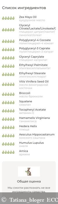 масло виноградной косточки* (Vitis Vinifera (Grape) Seed Oil); масло брокколи* (Brassica Oleracea Italica (Broccoli) Seed Oil); сквалан* (Squalane);