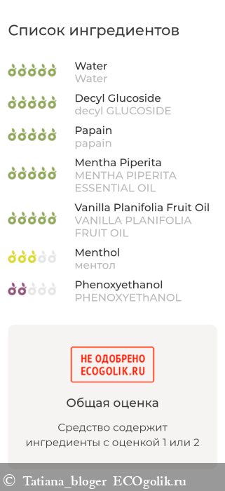 WATER, CALCIUM LACTAT, SILICA DIOXIDE, DECYL GLUCOSIDE, PAPAIN, SORBIT, WHITE TEA OIL, MENTHA PIPERITA ESSENTIAL OIL, VANILLA PLANIFOLIA FRUIT OIL, MENTOL, SODIUME SORBATE, PHENOXYETHANOL