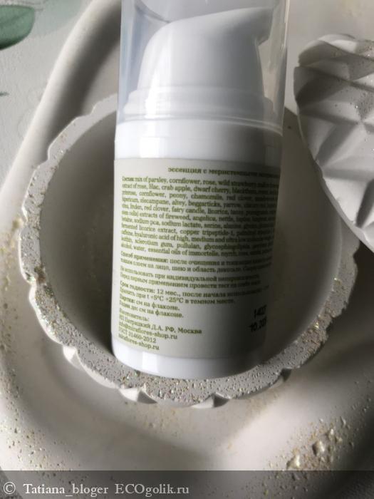 Микс гидролатов петрушки, василька, розы, земляники, мальвы; меристемный масляный экстракт цветочных почек розы, сирени, яблони дикой, терна, рябины, вишни дикой, лапчатки, календулы, мальвы, примулы вечерней, василька, пиона, ромашки, клевера, таволги, винограда; мацераты зверобоя, девясила, корня алтея, череды, тысячелистника, корней цикория, медуницы, одуванчика, календулы, шалфея; экстракты витекса священного, липы, клевера, цимицифуги, солодки, пижмы, граната, малины, ангелики, хмеля; меристемные экстракты ростков кипрея, ангелики, крапивы, люпина, медуницы, почек клена вязолистного, малины, люцерны; ниацинамид, комплекс аминокислот, экстракт солодки биоферментированной, комплекс пептидов: трипептид меди (copper tripeptide-1), пальмитоил трипептид (palmitoyl tripeptide-1), декстран, трипептид (tripeptide-1), провитамин В5, кофеин, гиалуроновая кислота трёх видов молекулярной массы, азамид, глюконолактон, силигель, гликосфинголипиды, пентиленгликоль, глицерин, шаромикс 721, л глютаминовая кислота, эфирные масла бессмертника, мирры, розы, сандала, пальмарозы.