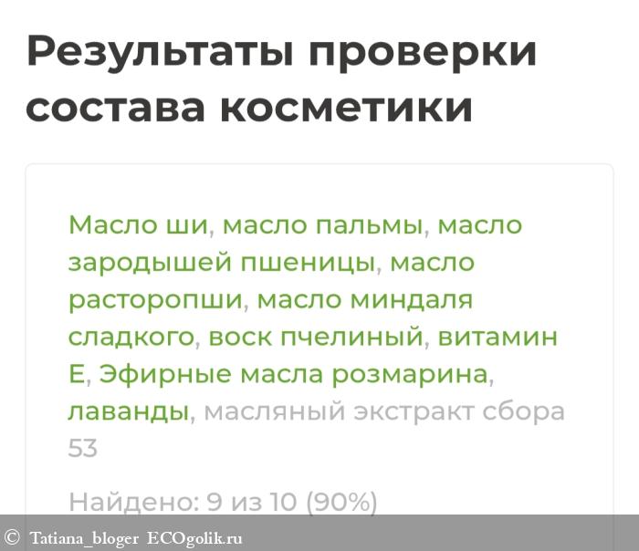 Масло ши, масло пальмы, масло зародышей пшеницы, масло расторопши, масло миндаля сладкого, воск пчелиный, витамин Е, Эфирные масла розмарина и лаванды, масляный экстракт сбора 53 (лист черного тополя, лист березы повислой, трава эхинацеи, трава вероники, трава коровяка скипетровидного, трава сушеницы топяной, трава лаванды колосковой, трава полыни горькой, кора дуба, кора осины, корни дягеля, корни лопуха большого, корни герани, корни девясила, корни кровохлёбки).