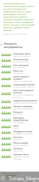 масло кокосовое, воск пчелиный, воск соевый, масло ши, масло миндальное, стеариновая кислота, масло виноградной косточки, гидроксиэтилмочевина, экстракты зверобоя, ромашки, календулы, липы, токоферола ацетат, ланолин, масло жожоба, пантенол, эфирное масло лаванды