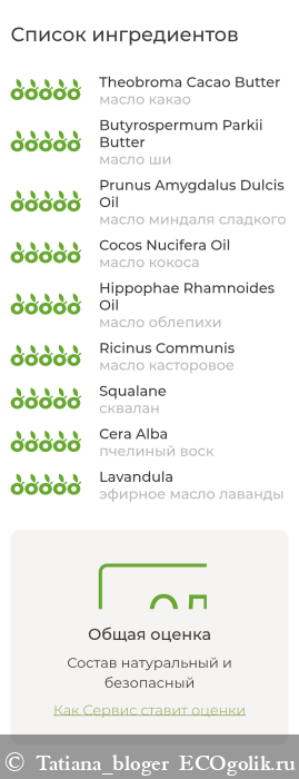 масло какао, масло ши, масло миндаля сладкого, масло кокоса, масло облепихи масло касторовое, сквалан, пчелиный воск, эфирное масло лаванды