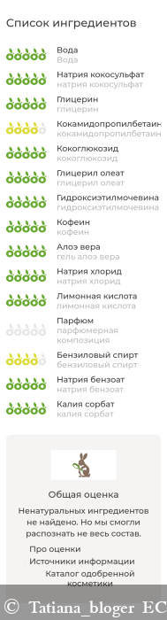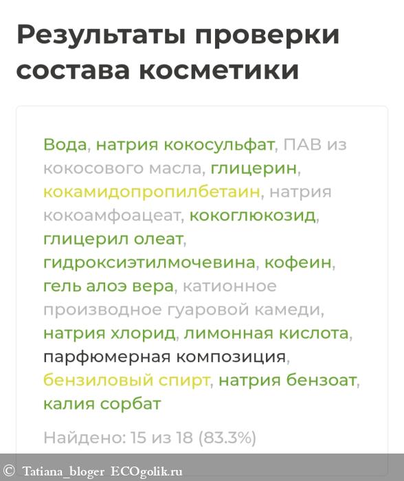 Вода, натрия кокосульфат / ПАВ из кокосового масла, глицерин, кокамидопропилбетаин, натрия кокоамфоацеат, кокоглюкозид, глицерил олеат, гидроксиэтилмочевина, кофеин, гель алоэ вера, катионное производное гуаровой камеди, натрия хлорид, лимонная кислота, парфюмерная композиция, бензиловый спирт, натрия бензоат, калия сорбат.