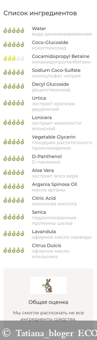 вода деионизированная, кокоглюкозид, кокамидопропилбетаин,кокосульфат натрия, децилглюкозид, экстракт крапивы двудомной, экстракт жимолости японской, глицерин растительного происхождения, D-пантенол, экстракт алоэ вера, масло арганы, лимонная кислота, гидролизованные протеины шелка, эфирное масло кардамона, эфирное масло лаванды, эфирное масло апельсина.