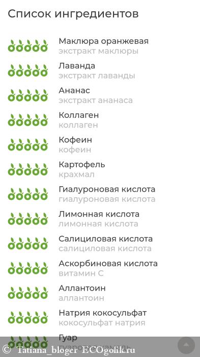 экстракт маклюры, экстракт лаванды, экстракт ананаса, коллаген, кофеин, крахмал, гиалуроновая кислота, аскорбиновая кислота, лимонная кислота, салициловая кислота, витамин С, аллантоин, кокосульфат натрия, гуаровая камедь, окись цинка, глицин, микротальк, ароматическая композиция эфирных масел