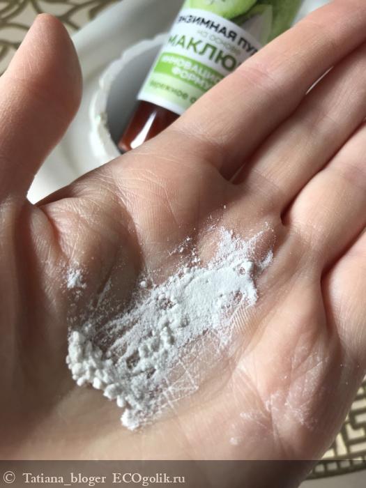 - Пудра отлично очищает поры, кожа начинает дышать. Не раздражает кожу, не вызывает дискомфорт. Легко смывается водой. Не сушит кожу и не стягивает её.
