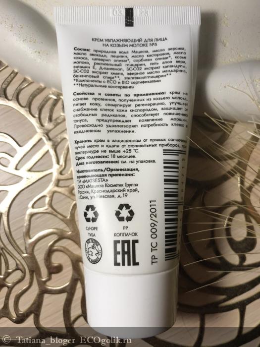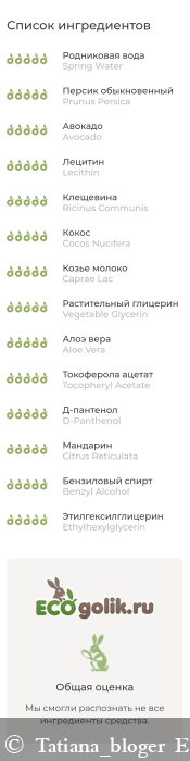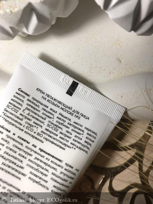 природная вода Мацеста, масло персика, масло авокадо, лецитин, масло касторовое, масло кокоса, цетеарил оливат* сорбитан оливат*, козье молоко, растительный глицерин, гель алоэ вера, витамин Е, Д-пантенол, ЅС-СО2 экстракт календулы, ЅС-С02 экстракт хмеля, эфирное масло мандарина, бензиловый спирт, этилгексилглицерин * Компоненты с ЕСО и ВІО сертификатами ** Натуральные консерванты