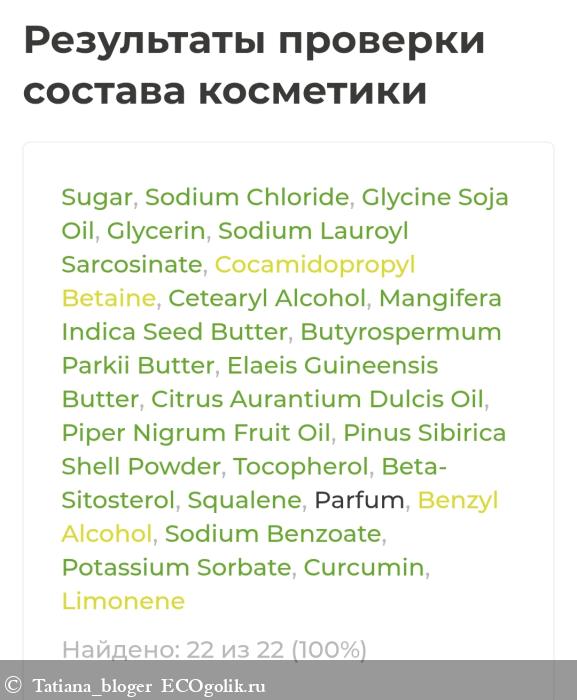 Sugar (Сахар), Sodium Chloride (Соль), Glycine Soja Oil (Масло соевое), Glycerin (Глицерин), Sodium Lauroyl Sarcosinate (Натрия лауроил саркозинат), Cocamidopropyl Betaine (Кокамидопропилбетаин), Cetearyl Alcohol (Цетеариловый спирт), Mangifera Indica Seed Butter (Масло манго баттер), Butyrospermum Parkii Butter (Масло ши баттер), Elaeis Guineensis Butter (Пальмовое масло-баттер), Citrus Aurantium Dulcis Oil (Эфирное масло сладкого апельсина), Piper Nigrum Fruit Oil (Эфирное масло чёрного перца), Pinus Sibirica Shell Powder (Скорлупа кедрового ореха), Tocopherol, (Токоферол / витамин Е), Beta-Sitosterol (Бета-ситостерол), Squalene (Сквален), Parfum (Отдушка), Benzyl Alcohol, Sodium Benzoate, Potassium Sorbate (Бензиловый спирт, натрия бензоат, калия сорбат / консерванты, разрешённые по стандарту COSMOS для производства органической косметики), Curcumin (Куркумин / натуральный краситель), Limonene (Лимонен / компонент эфирных масел).