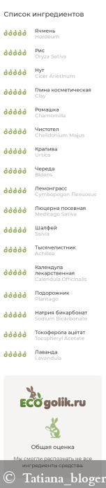 ячмень, рис, овёс, нут, глина белая, ромашка, чистотел, крапива, череда, лемонграсс, люцерна, шалфей, тысячелистник, пустырник, овес трава, календула, подорожник, бикарбонат натрия (сода), витамин Е, эфирное масло лаванды