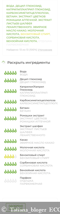 ВОДА, ДЕЦИЛ ГЛЮКОЗИД, КАПРИЛИЛ/КАПРИЛ ГЛЮКОЗИД, КАРБОКСИМЕТИЛЦЕЛЛЮЛОЗА, БЕТАИН, ЭКСТРАКТ ЦВЕТКОВ РОМАШКИ АПТЕЧНОЙ, ЭКСТРАКТ ЛИСТЬЕВ ШАЛФЕЯ ЛЕКАРСТВЕННОГО, ЭФИРНОЕ МАСЛО КАКАО, МОЛОЧНАЯ КИСЛОТА, БЕНЗИЛОВЫЙ СПИРТ, СОРБИНОВАЯ КИСЛОТА, БЕНЗОЙНАЯ КИСЛОТА, ОТДУШКА ПАРФЮМЕРНАЯ