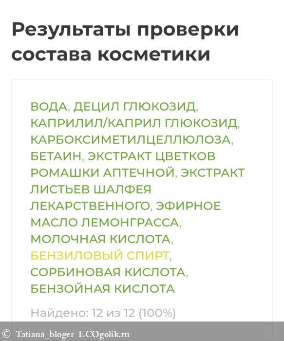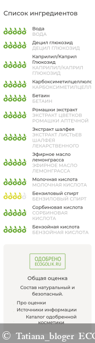 ВОДА, ДЕЦИЛ ГЛЮКОЗИД, КАПРИЛИЛ/КАПРИЛ ГЛЮКОЗИД, КАРБОКСИМЕТИЛЦЕЛЛЮЛОЗА, БЕТАИН, ЭКСТРАКТ ЦВЕТКОВ РОМАШКИ АПТЕЧНОЙ, ЭКСТРАКТ ЛИСТЬЕВ ШАЛФЕЯ ЛЕКАРСТВЕННОГО, ЭФИРНОЕ МАСЛО ЛЕМОНГРАССА, МОЛОЧНАЯ КИСЛОТА, БЕНЗИЛОВЫЙ СПИРТ, СОРБИНОВАЯ КИСЛОТА, БЕНЗОЙНАЯ КИСЛОТА