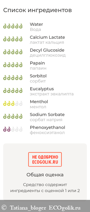 Вода, лактат кальция, диоксид кремнезема, децилглюкозид, папаин, сорбит, угольный порошок, эфирное масло ментха-пепирита, экстракт эвкалипта, ментол, сорбат натрия, феноксиэтанол