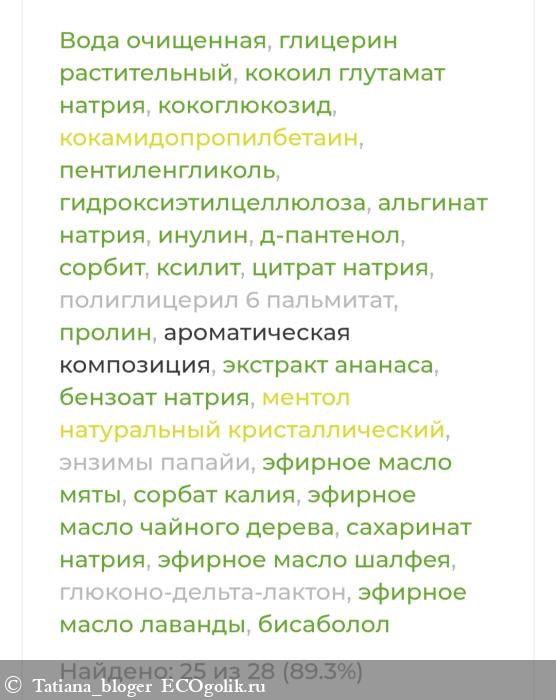 Вода очищенная, глицерин растительный, кокоил глутамат натрия, кокоглюкозид и кокамидопропилбетаин (натуральные очищающие компоненты из растительного сырья), пентиленгликоль (натуральный увлажнитель с сертификатом COSMOS), гидроксиэтилцеллюлоза и альгинат натрия (натуральные загустители), инулин (растительный пребиотик), д-пантенол (провитамин В5), сорбит и ксилит (натуральные подсластители), цитрат натрия (натуральный регулятор кислотности), полиглицерил 6 пальмитат и пролин (натуральный стабилизирующий компонент), ароматическая композиция, экстракт ананаса, бензоат натрия (консервант для натуральной косметики), ментол натуральный кристаллический, энзимы папайи (пищевые ферменты, экстрагированные из плодов папайи и ананаса), эфирное масло мяты, сорбат калия (консервант для натуральной косметики), эфирное масло чайного дерева, сахаринат натрия (пищевой подсластитель), эфирное масло шалфея, глюконо-дельта-лактон (натуральный увлажнитель), эфирное масло лаванды, бисаболол (натуральный противовоспалительный компонент
