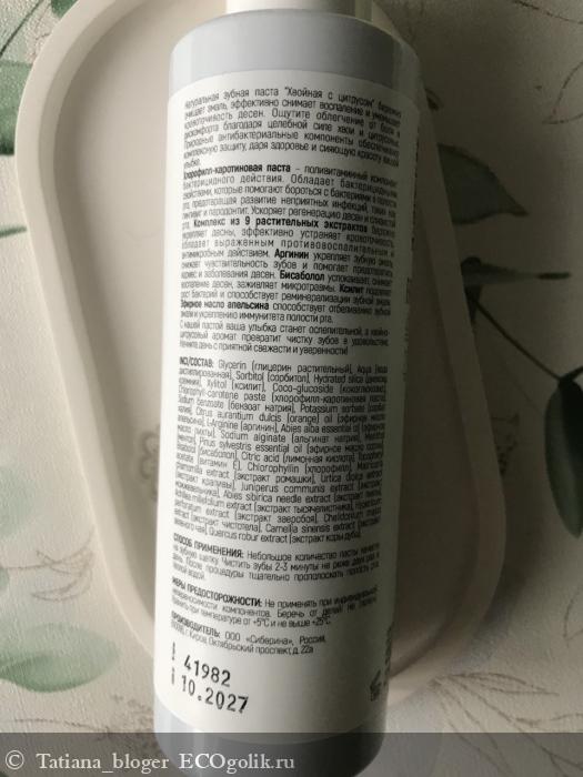 Glycerin (глицерин растительный), Aqua (вода дистиллированная), Sorbitol (сорбитол), Hydrated silica (диоксид кремния), Xylitol (ксилит), Coco-glucoside (кокоглюкозид), Chlorophyll-carotene paste (хлорофилл-каротиновая паста), Sodium benzoate (бензоат натрия), Potassium sorbate (сорбат калия), Citrus aurantium dulcis (orange) oil (эфирное масло апельсина), L-Arginine (аргинин), Abies alba essential oil (эфирное масло пихты), Sodium alginate (альгинат натрия), Menthol (ментол), Pinus sylvestris essential oil (эфирное масло сосны), Bisabolol (бисаболол), Citric acid (лимонная кислота), Tocopheryl acetate (витамин Е), Chlorophyllin (хлорофилл), Matricaria chamomilla extract (экстракт ромашки), Urtica dioica extract (экстракт крапивы), Juniperus communis extract (экстракт можжевельника), Abies sibirica needle extract (экстракт пихты), Achillea millefolium extract (экстракт тысячелистника), Hypericum perforatum extract (экстракт зверобоя), Chelidonium majus extract (экстракт чистотела), Camellia sinensis extract (экстракт зеленого чая), Quercus robur extract (экстракт коры дуба).