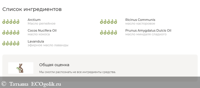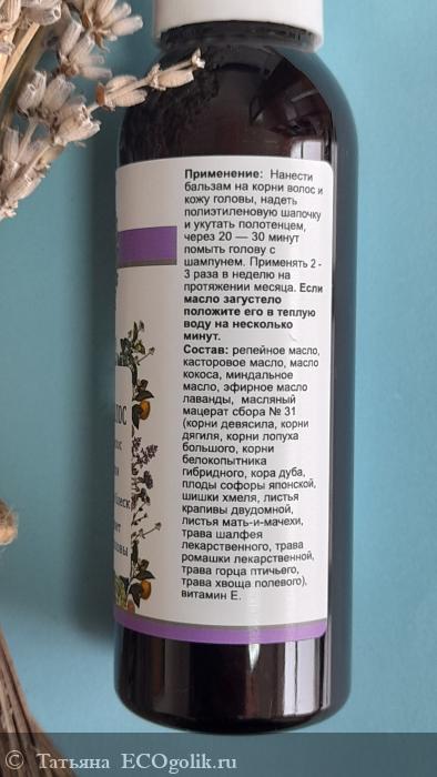 Масло репейное, масло касторовое, масло кокоса, масло миндаля сладкого, эфирное масло лаванды, масляный экстракт сбора трав №31 (корни девясила, корни дягиля, корни лопуха большого, корни белокопытника, кора дуба, плоды соборы японской, шишки хмеля, листья крапивы, лист мать-и-мачехи, трава шалфея лекарственного трава ромашки лекарственной, трава горца птичьего, трава хвоща полевого) витамин Е.