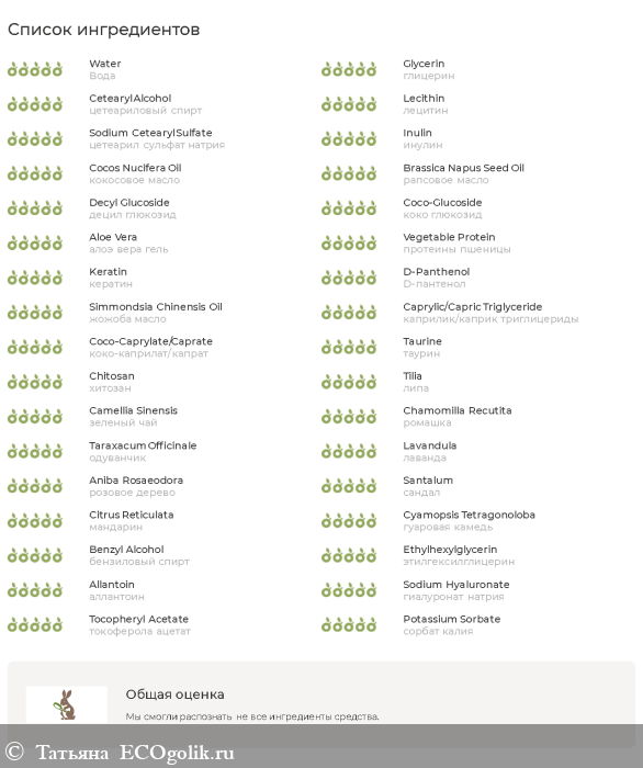Вода, гидролат лаванды, глицерин, цетеариловый спирт, лецитин, цетеарил сульфат натрия, инулин, кокосовое масло, рапсовое масло, децил глюкозид, коко глюкозид, алоэ вера гель, протеины пшеницы, кератин, D-пантенол, жожоба масло, каприлик/каприк триглицериды, коко-каприлат/капрат, таурин, хитозан, экстракты: липа, зеленый чай, ромашка, мелиса, одуванчик; эфирные масла: лаванда, розовое дерево, сандал, мандарин; гуаровая камедь, бензиловый спирт, этилгексилглицерин, аллантоин, гиалуронат натрия, токоферола ацетат (витамин Е), сорбат калия