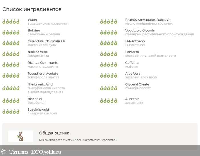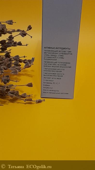 вода деионизированная, масло миндальных косточек, свекольный бетаин, глицерин растительного происхождения, экстракт трех австралийских суперфруктов: сливы какаду, сливы иллаварской и сливы бурдекинской, масло календулы, D-пантенол (провитамин В5), ниацинамид (витамин В3), гиалуроновая кислота низкомолекулярная, экстракт японской жимолости, масло клещевины, кофеин, токоферола ацетат (витамин Е), глюкозиды природных жирных кислот (кокоглюкозиды), увлажняющий полисахаридный комплекс на основе красных морских водорослей, экстракт алоэ вера, гиалуроновая кислота высокомолекулярная, глицерилолеат, бисаболол, комплекс полиненасыщенных высших жирных кислот (витамин F), аллантоин, янтарная кислота.