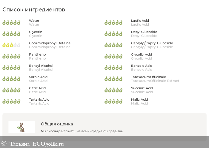 INCI: Water*, Lactic Acid*, Glycerin, Decyl Glucoside**, Cocamidopropyl Betaine**, Caprylyl/Capryl Glucoside**, Panthenol, Glycolic Acid*, Benzyl Alcohol**, Benzoic Acid**, Sorbic Acid**, Kalanchoe Extract*, Barbarea Vulgaris Extract*, Taraxacum Officinale Extract*, Citric Acid*, Succinic Acid*, Tartaric Acid*, Malic Acid*. *100% натуральные компоненты. ** компоненты, сертифицированные Ecocert и COSMOS Все компоненты разрешены к применению в натуральной косметике.